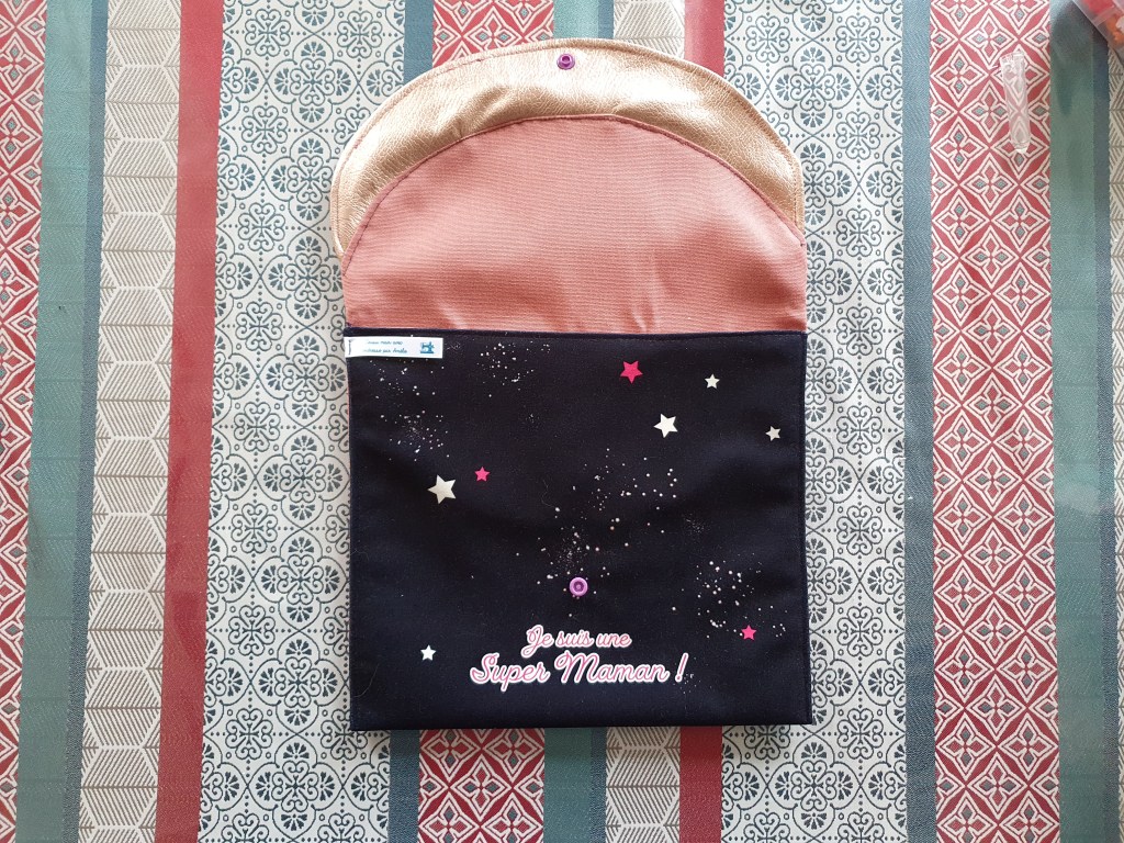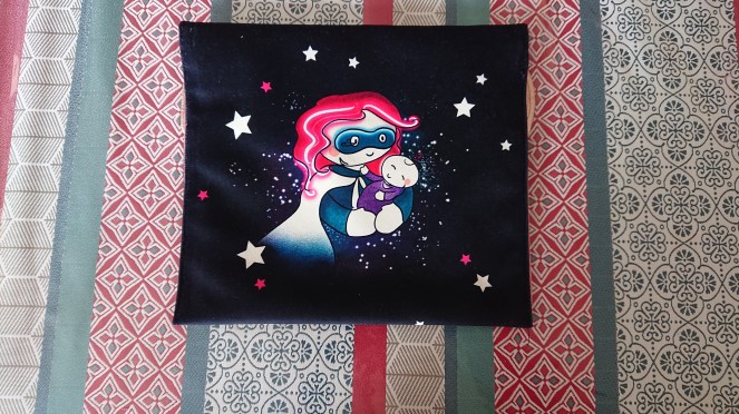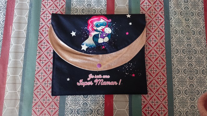 J’ai réalisé cette pochette Orane Super-Maman pour mon amie Cécile. Je lui ai offert pour la fête des mères. C’est en quelque sorte sa première fête des mères puisqu’elle est enceinte de son premier enfant.