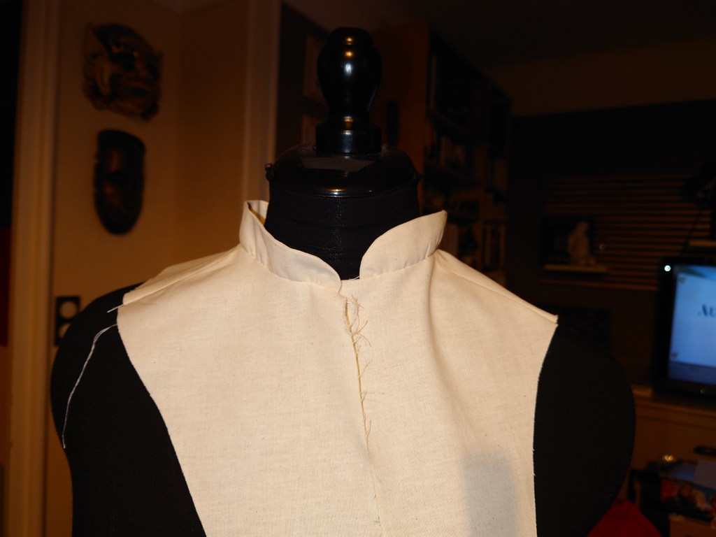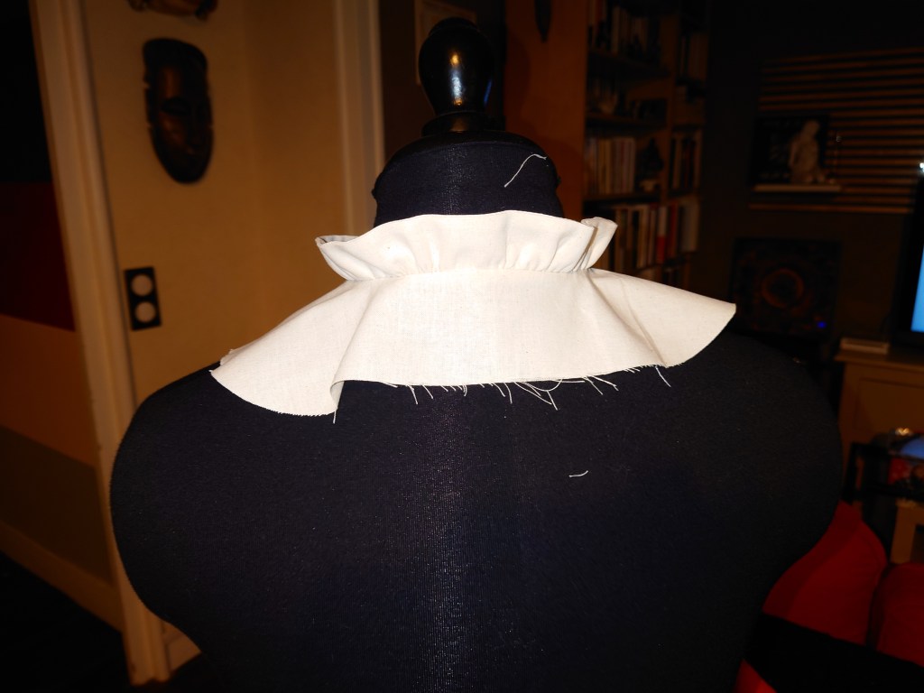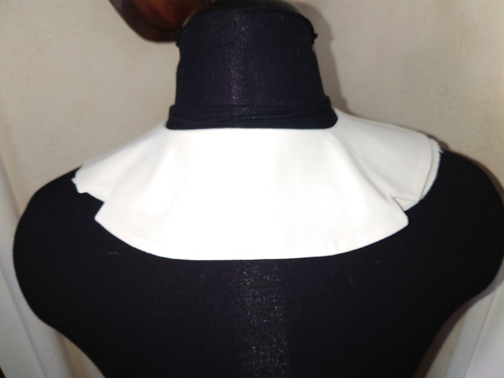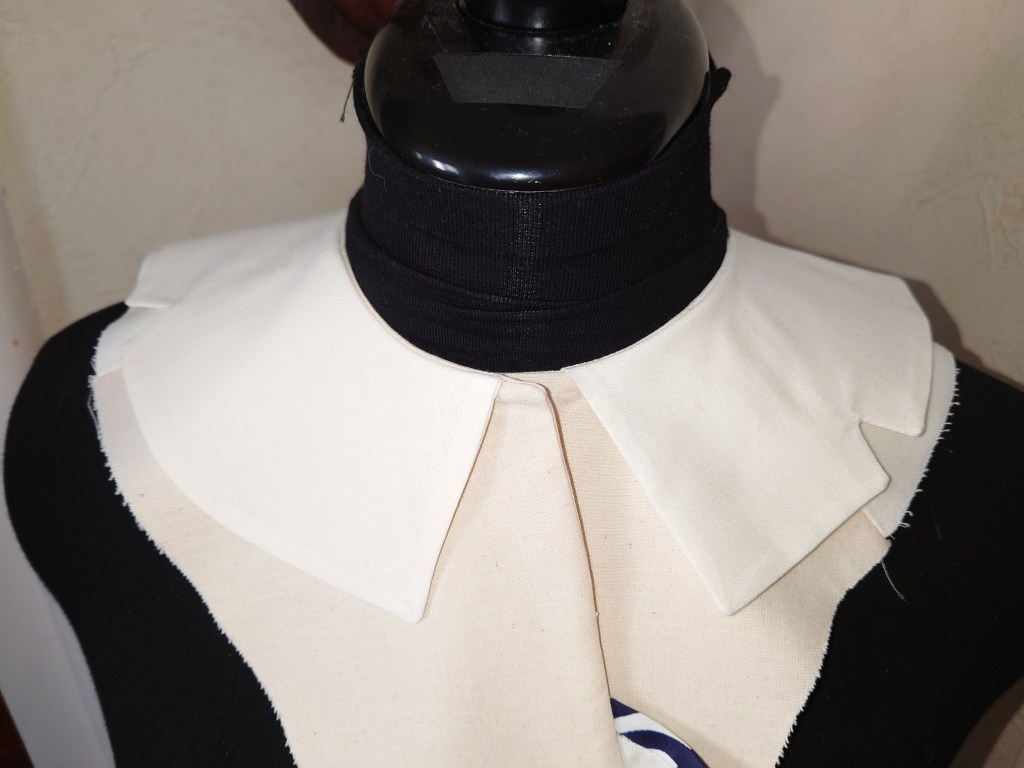 Pour cette variation, nous avons étudié comment monter un col plat placé sur l’ensemble de l’encolure et également un ruché le long de la croisure de devant.