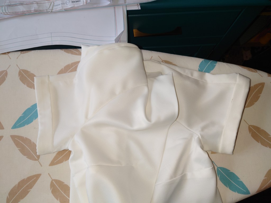 Du côté de la technique j’ai réalisé pour la première fois une patte de boutonnage invisible. C’était assez compliqué car le tissu est difficile à travailler et le repassage de cette matière est particulier. Mais j’ai réussi. Finalement, avec beaucoup de patience et un repassage à l’aide d’un réglet pour être au millimètre près m’ont permis de réaliser ce montage.