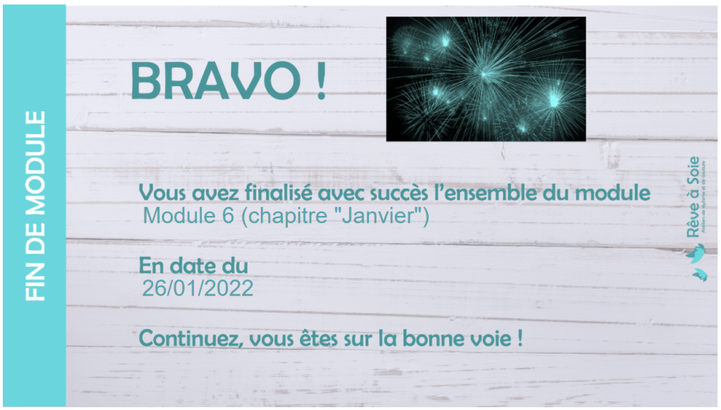 Voici le certificat de fin de module et l’appréciation de ma coach :