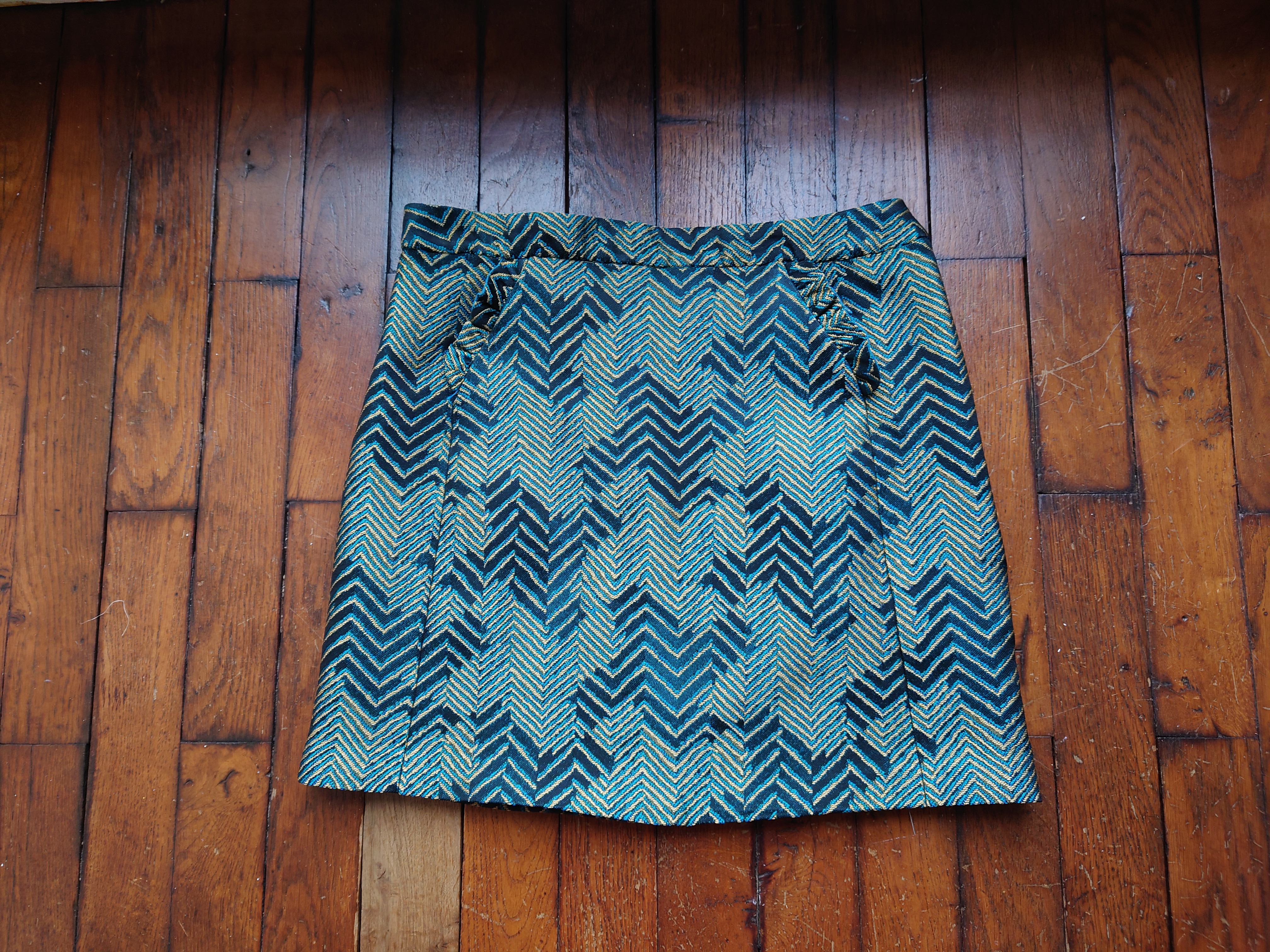 Selon la description du créateur Atelier Scammit :  » La jupe Novembre est une petite jupe droite mais pas crayon, elle vous donne toute la classe d’une jupe près du corps et toute la décontraction d’une jupe à poches, à souligner ou non de froufrous discrets. Comme j’aime ces contrastes ! «