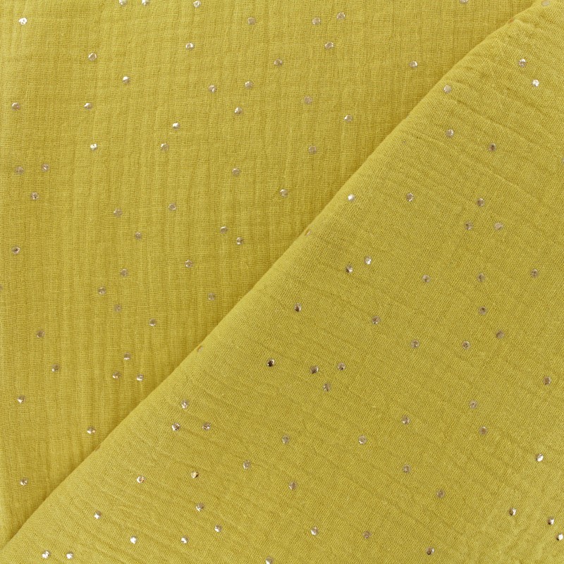 J’ai choisi un tissu double gaz moutarde à pois doré que j’avais dans mon stock. Ce tissu est idéal en camping car il ne nécessite pas de repassage.