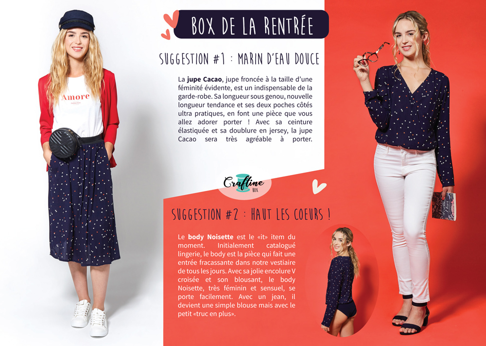 Craftine nous indique que « Le body Noisette est le « it » item du moment. Initialement catalogué lingerie, le body fait une entrée fracassante dans notre vestiaire de tous les jours. Bas en jersey hyper confort et Haut en crépon viscose pour plus de classe. Sa jolie encolure croisée en V blousante apporte décontraction et sensualité. Le body peut au premier abord apparaître comme une pièce mode pointue, mais à porter avec un jean, il devient une simple blouse avec un petit « truc en plus ». On peut bouger, sauter, se pencher, on est sûre que notre body blouse restera bien en place dans notre jean, et ça c’est top ! »