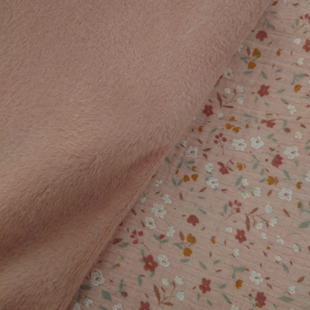 Pour réaliser ce projet j’ai commandé les tissus chez Ma Petite Mercerie. J’ai choisi un tissu double gaze de coton Fleurette de couleur rose ainsi qu’un tissu sweat envers minkee uni également de couleur rose.