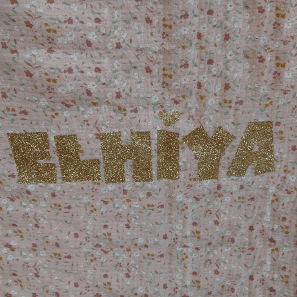 J’ai personnalisé la couverture avec son prénom avec du flex pailleté de couleur or.